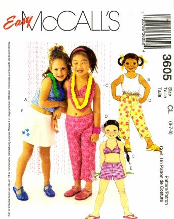 Sleeveless pullover top A has topstitching; top B has drawstring; self-lined bikini top C has straps extending into tie ends and drawstring tie on lower edge; capri pants, shorts or skort have elastic back waist; skort F has purchased applique or machine embroidered applique.